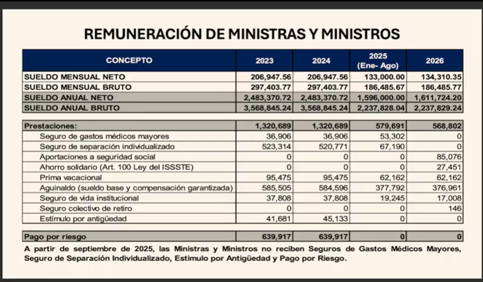 - Following controversies over new robes and luxury SUVs, President Sheinbaum presented a comparative breakdown of the incomes of former ministers and current members of the Supreme Court at her morning press conference. She highlighted that the new ministers, elected by popular vote, receive 2.2 million pesos per year compared to the previous 3.5 million, representing a 38% decrease. In addition, benefits fell from 1.3 million in 2023 to 569,802 in 2026, and from September 2025, benefits such as major medical insurance, seniority bonuses, and hazard pay are no longer granted.